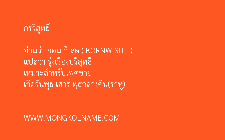 กรวิสุทธิ์ มีความหมายในภาษาบาลี แปลว่า ผู้มีการงานอันหมดจด ( KORNWISUT ) อ่านว่า กอน-วิ-สุด ตั้งชื่อมงคล เหมาะสำหรับเพศชาย เกิดวันพุธ เสาร์ พุธกลางคืน(ราหู)