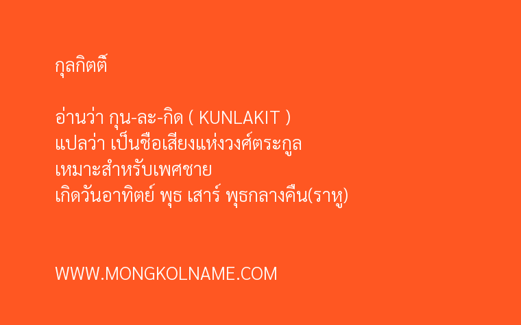 กุลกิตติ์ มีความหมายในภาษาบาลี แปลว่า เป็นชื่อเสียงแห่งวงศ์ตระกูล ( KUNLAKIT ) อ่านว่า กุน-ละ-กิด ตั้งชื่อมงคล เหมาะสำหรับเพศชาย เกิดวันอาทิตย์ พุธ เสาร์ พุธกลางคืน(ราหู)