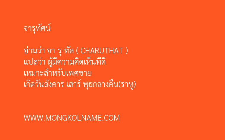 จารุทัศน์ มีความหมายในภาษาบาลี แปลว่า ผู้มีความคิดเห็นที่ดี ( CHARUTHAT ) อ่านว่า จา-รุ-ทัด ตั้งชื่อมงคล เหมาะสำหรับเพศชาย เกิดวันอังคาร เสาร์ พุธกลางคืน(ราหู)