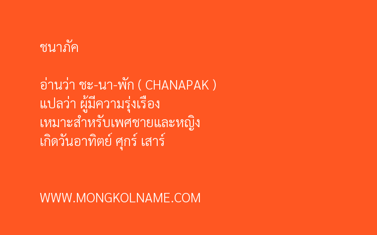 ชนาภัค มีความหมายในภาษาบาลี แปลว่า ผู้มีความรุ่งเรือง ( CHANAPAK ) อ่านว่า ชะ-นา-พัก ตั้งชื่อมงคล เหมาะสำหรับเพศชายและหญิง เกิดวันอาทิตย์ ศุกร์ เสาร์