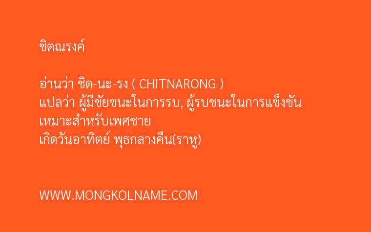 ชิตณรงค์ มีความหมายในภาษาบาลี แปลว่า ผู้มีชัยชนะในการรบ, ผู้รบชนะในการแข็งขัน ( CHITNARONG ) อ่านว่า ชิด-นะ-รง ตั้งชื่อมงคล เหมาะสำหรับเพศชาย เกิดวันอาทิตย์ พุธกลางคืน(ราหู)