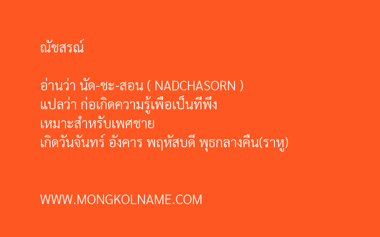 ณัชสรณ์ มีความหมายในภาษาบาลี แปลว่า ก่อเกิดความรู้เพื่อเป็นที่พึ่ง ( NADCHASORN ) อ่านว่า นัด-ชะ-สอน ตั้งชื่อมงคล เหมาะสำหรับเพศชาย เกิดวันจันทร์ อังคาร พฤหัสบดี พุธกลางคืน(ราหู)