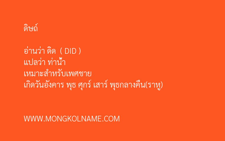 ดิษถ์ มีความหมายในภาษาบาลี แปลว่า ท่าน้ำ ( DID ) อ่านว่า ดิด ตั้งชื่อมงคล เหมาะสำหรับเพศชาย เกิดวันอังคาร พุธ ศุกร์ เสาร์ พุธกลางคืน(ราหู)