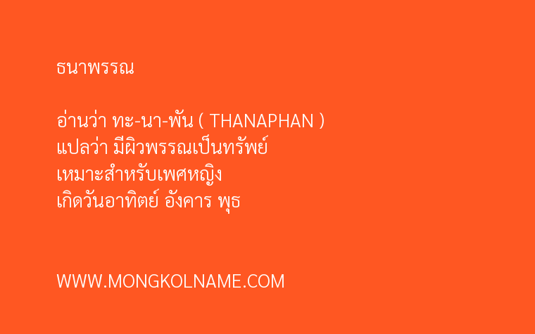 ธนาพรรณ มีความหมายในภาษาบาลี แปลว่า มีผิวพรรณเป็นทรัพย์ ( THANAPHAN ) อ่านว่า ทะ-นา-พัน ตั้งชื่อมงคล เหมาะสำหรับเพศหญิง เกิดวันอาทิตย์ อังคาร พุธ