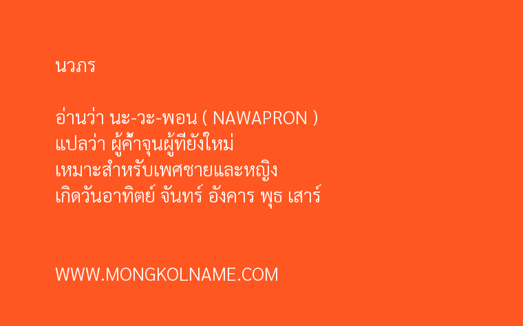 นวภร มีความหมายในภาษาบาลี แปลว่า ผู้ค้ำจุนผู้ที่ยังใหม่ ( NAWAPRON ) อ่านว่า นะ-วะ-พอน ตั้งชื่อมงคล เหมาะสำหรับเพศชายและหญิง เกิดวันอาทิตย์ จันทร์ อังคาร พุธ เสาร์
