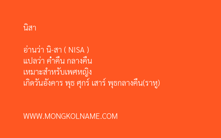 นิสา มีความหมายในภาษาบาลี แปลว่า ค่ำคืน กลางคืน ( NISA ) อ่านว่า นิ-สา ตั้งชื่อมงคล เหมาะสำหรับเพศหญิง เกิดวันอังคาร พุธ ศุกร์ เสาร์ พุธกลางคืน(ราหู)