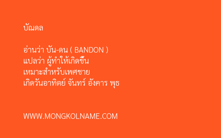 บัณดล มีความหมายในภาษาบาลี แปลว่า ผู้ทำให้เกิดขึ้น ( BANDON ) อ่านว่า บัน-ดน ตั้งชื่อมงคล เหมาะสำหรับเพศชาย เกิดวันอาทิตย์ จันทร์ อังคาร พุธ