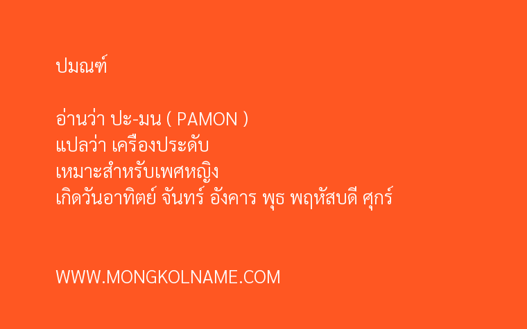 ปมณฑ์ มีความหมายในภาษาบาลี แปลว่า เครื่องประดับ ( PAMON ) อ่านว่า ปะ-มน ตั้งชื่อมงคล เหมาะสำหรับเพศหญิง เกิดวันอาทิตย์ จันทร์ อังคาร พุธ พฤหัสบดี ศุกร์