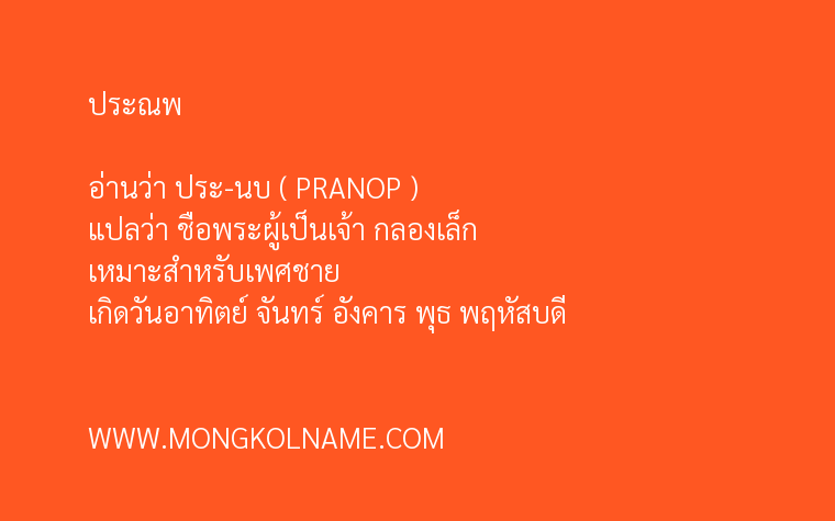 ประณพ มีความหมายในภาษาบาลี แปลว่า ชื่อพระผู้เป็นเจ้า กลองเล็ก ( PRANOP ) อ่านว่า ประ-นบ ตั้งชื่อมงคล เหมาะสำหรับเพศชาย เกิดวันอาทิตย์ จันทร์ อังคาร พุธ พฤหัสบดี