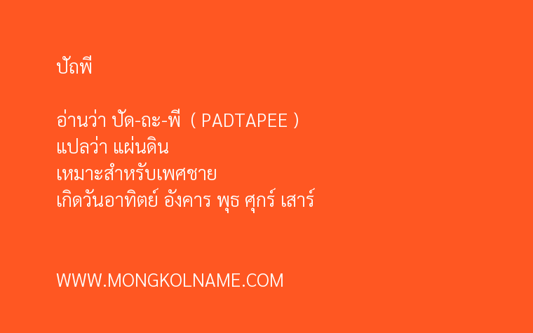 ปัถพี มีความหมายในภาษาบาลี แปลว่า แผ่นดิน ( PADTAPEE ) อ่านว่า ปัด-ถะ-พี ตั้งชื่อมงคล เหมาะสำหรับเพศชาย เกิดวันอาทิตย์ อังคาร พุธ ศุกร์ เสาร์