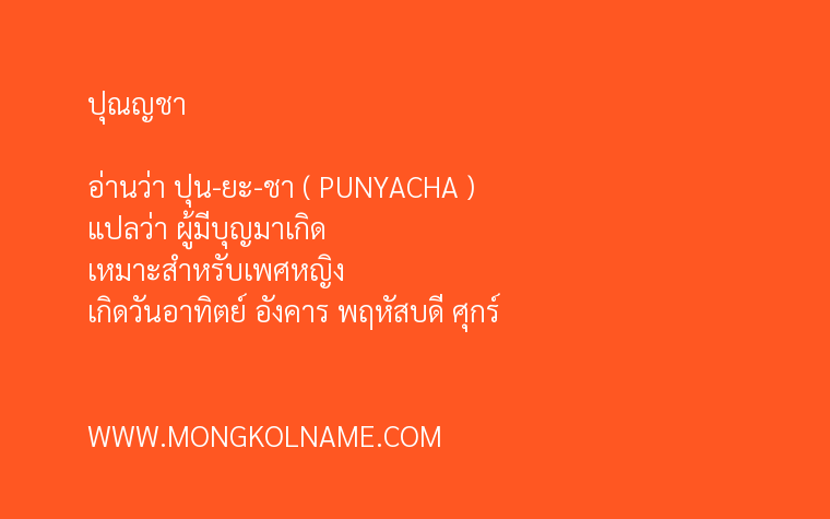ปุณญชา มีความหมายในภาษาบาลี แปลว่า ผู้มีบุญมาเกิด ( PUNYACHA ) อ่านว่า ปุน-ยะ-ชา ตั้งชื่อมงคล เหมาะสำหรับเพศหญิง เกิดวันอาทิตย์ อังคาร พฤหัสบดี ศุกร์