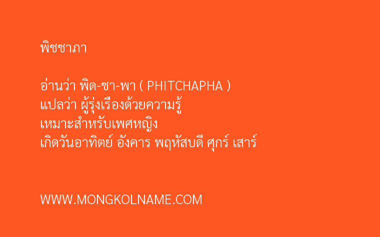 พิชชาภา มีความหมายในภาษาบาลี แปลว่า ผู้รุ่งเรืองด้วยความรู้ ( PHITCHAPHA ) อ่านว่า พิด-ชา-พา ตั้งชื่อมงคล เหมาะสำหรับเพศหญิง เกิดวันอาทิตย์ อังคาร พฤหัสบดี ศุกร์ เสาร์