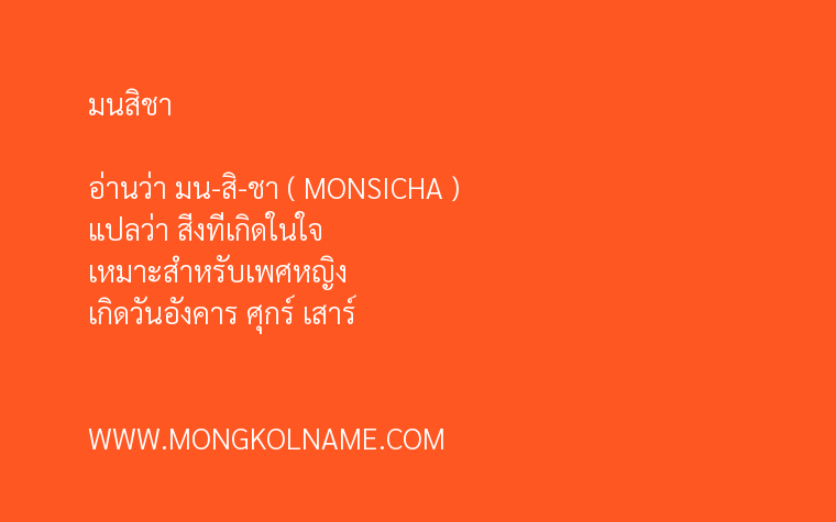 มนสิชา มีความหมายในภาษาบาลี แปลว่า สิ่งที่เกิดในใจ ( MONSICHA ) อ่านว่า มน-สิ-ชา ตั้งชื่อมงคล เหมาะสำหรับเพศหญิง เกิดวันอังคาร ศุกร์ เสาร์