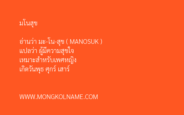 มโนสุข มีความหมายในภาษาบาลี แปลว่า ผู้มีความสุขใจ ( MANOSUK ) อ่านว่า มะ-โน-สุข ตั้งชื่อมงคล เหมาะสำหรับเพศหญิง เกิดวันพุธ ศุกร์ เสาร์