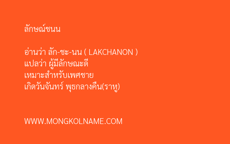 ลักษณ์ชนน มีความหมายในภาษาบาลี แปลว่า ผู้มีลักษณะดี ( LAKCHANON ) อ่านว่า ลัก-ชะ-นน ตั้งชื่อมงคล เหมาะสำหรับเพศชาย เกิดวันจันทร์ พุธกลางคืน(ราหู)