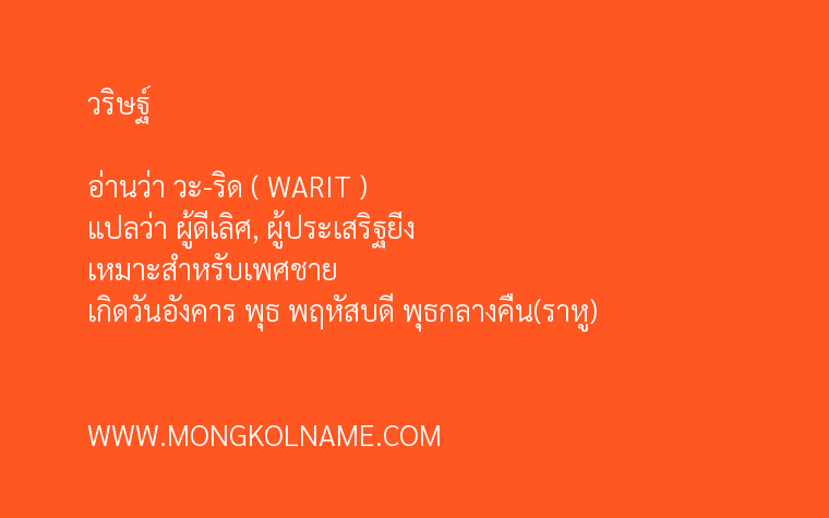 วริษฐ์ มีความหมายในภาษาบาลี แปลว่า ผู้ดีเลิศ, ผู้ประเสริฐยิ่ง ( WARIT ) อ่านว่า วะ-ริด ตั้งชื่อมงคล เหมาะสำหรับเพศชาย เกิดวันอังคาร พุธ พฤหัสบดี พุธกลางคืน(ราหู)