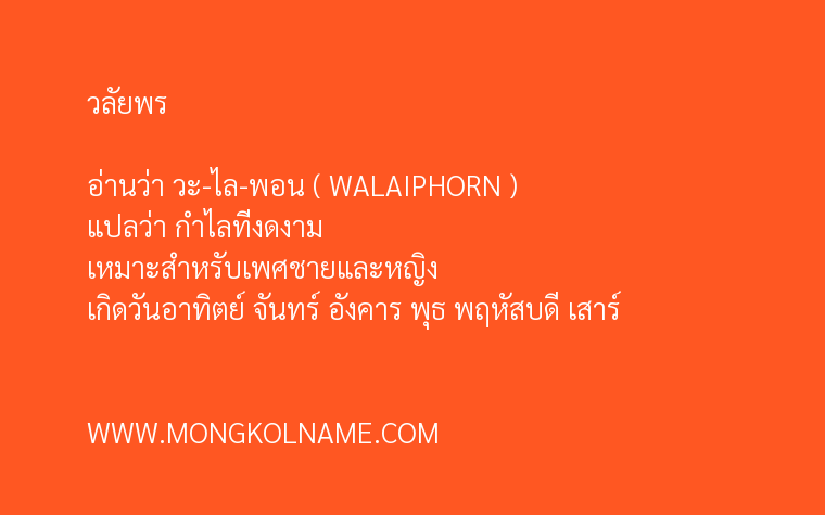 วลัยพร มีความหมายในภาษาบาลี แปลว่า กำไลที่งดงาม ( WALAIPHORN ) อ่านว่า วะ-ไล-พอน ตั้งชื่อมงคล เหมาะสำหรับเพศชายและหญิง เกิดวันอาทิตย์ จันทร์ อังคาร พุธ พฤหัสบดี เสาร์