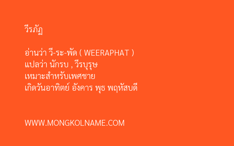 วีรภัฏ มีความหมายในภาษาบาลี แปลว่า นักรบ , วีรบุรุษ ( WEERAPHAT ) อ่านว่า วี-ระ-พัด ตั้งชื่อมงคล เหมาะสำหรับเพศชาย เกิดวันอาทิตย์ อังคาร พุธ พฤหัสบดี