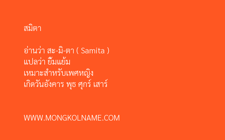 สมิตา มีความหมายในภาษาบาลี แปลว่า ยิ้มแย้ม ( Samita ) อ่านว่า สะ-มิ-ตา ตั้งชื่อมงคล เหมาะสำหรับเพศหญิง เกิดวันอังคาร พุธ ศุกร์ เสาร์