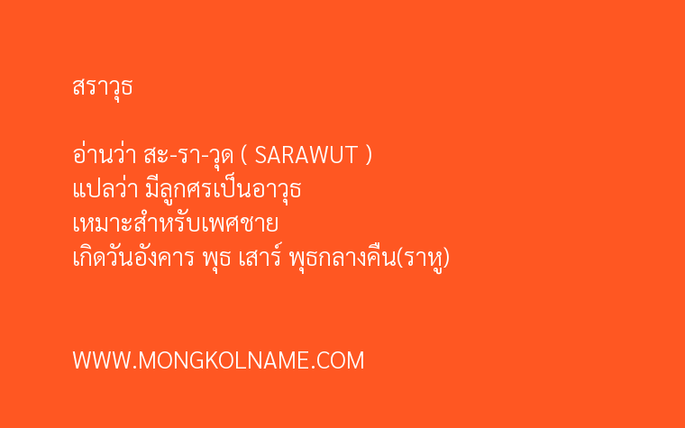 สราวุธ มีความหมายในภาษาบาลี แปลว่า มีลูกศรเป็นอาวุธ ( SARAWUT ) อ่านว่า สะ-รา-วุด ตั้งชื่อมงคล เหมาะสำหรับเพศชาย เกิดวันอังคาร พุธ เสาร์ พุธกลางคืน(ราหู)