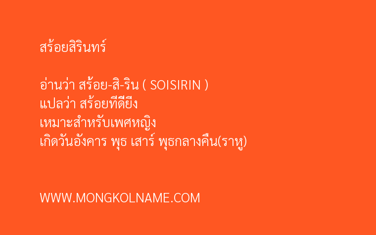 สร้อยสิรินทร์ มีความหมายในภาษาบาลี แปลว่า สร้อยที่ดีียิ่ง ( SOISIRIN ) อ่านว่า สร้้อย-สิ-ริน ตั้งชื่อมงคล เหมาะสำหรับเพศหญิง เกิดวันอังคาร พุธ เสาร์ พุธกลางคืน(ราหู)