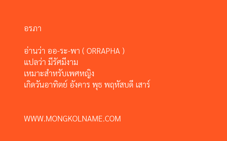 อรภา มีความหมายในภาษาบาลี แปลว่า มีรัศมีงาม ( ORRAPHA ) อ่านว่า ออ-ระ-พา ตั้งชื่อมงคล เหมาะสำหรับเพศหญิง เกิดวันอาทิตย์ อังคาร พุธ พฤหัสบดี เสาร์
