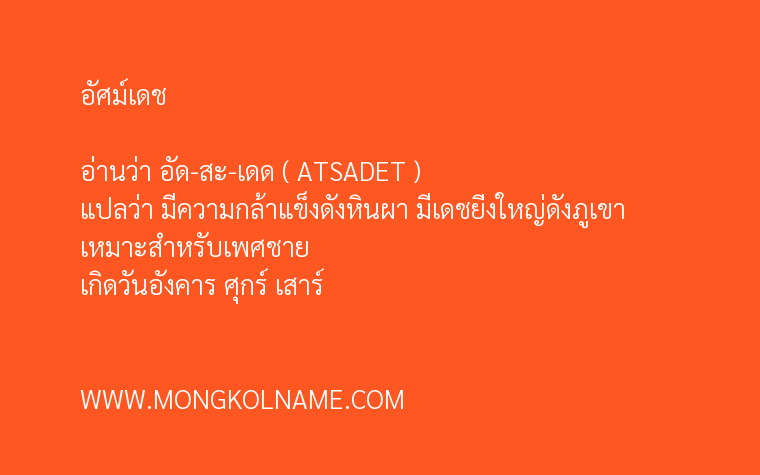 อัศม์เดช มีความหมายในภาษาบาลี แปลว่า มีความกล้าแข็งดังหินผา มีเดชยิ่งใหญ่ดังภูเขา ( ATSADET ) อ่านว่า อัด-สะ-เดด ตั้งชื่อมงคล เหมาะสำหรับเพศชาย เกิดวันอังคาร ศุกร์ เสาร์