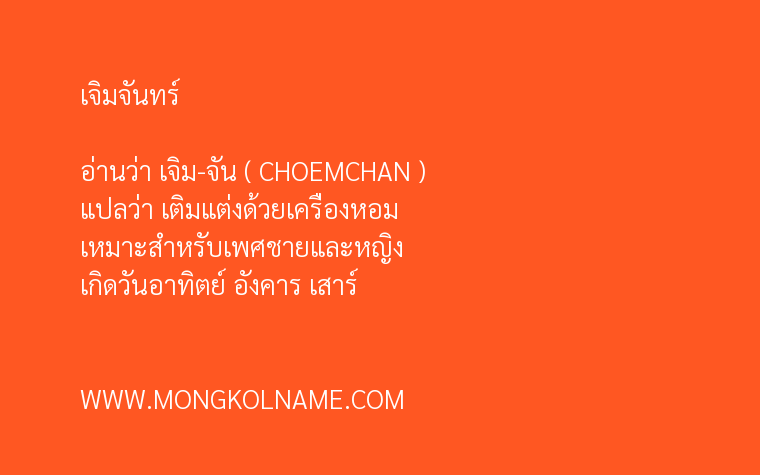 เจิมจันทร์ มีความหมายในภาษาบาลี แปลว่า เติมแต่งด้วยเครื่องหอม ( CHOEMCHAN ) อ่านว่า เจิม-จัน ตั้งชื่อมงคล เหมาะสำหรับเพศชายและหญิง เกิดวันอาทิตย์ อังคาร เสาร์