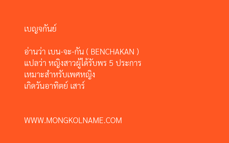 เบญจกันย์ มีความหมายในภาษาบาลี แปลว่า หญิงสาวผู้ได้รับพร 5 ประการ ( BENCHAKAN ) อ่านว่า เบน-จะ-กัน ตั้งชื่อมงคล เหมาะสำหรับเพศหญิง เกิดวันอาทิตย์ เสาร์