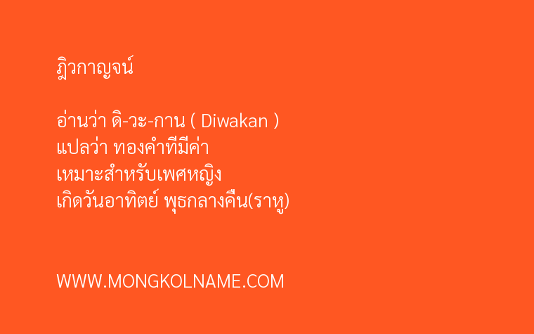 ฎิวกาญจน์ มีความหมายในภาษาบาลี แปลว่า ทองคำที่มีค่า ( Diwakan ) อ่านว่า ดิ-วะ-กาน ตั้งชื่อมงคล เหมาะสำหรับเพศหญิง เกิดวันอาทิตย์ พุธกลางคืน(ราหู)