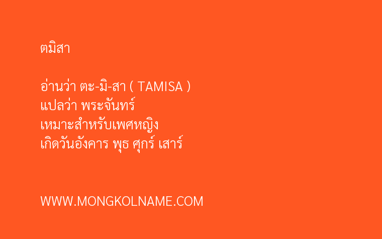 ตมิสา มีความหมายในภาษาบาลี แปลว่า พระจันทร์ ( TAMISA ) อ่านว่า ตะ-มิ-สา ตั้งชื่อมงคล เหมาะสำหรับเพศหญิง เกิดวันอังคาร พุธ ศุกร์ เสาร์