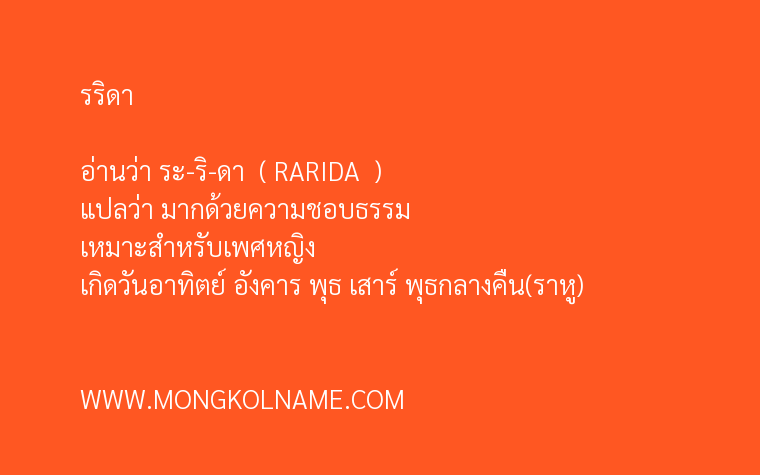 รริดา มีความหมายในภาษาบาลี แปลว่า มากด้วยความชอบธรรม ( RARIDA ) อ่านว่า ระ-ริ-ดา ตั้งชื่อมงคล เหมาะสำหรับเพศหญิง เกิดวันอาทิตย์ อังคาร พุธ เสาร์ พุธกลางคืน(ราหู)