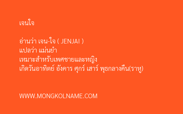เจนใจ มีความหมายในภาษาบาลี แปลว่า แม่นยำ ( JENJAI ) อ่านว่า เจน-ใจ ตั้งชื่อมงคล เหมาะสำหรับเพศชายและหญิง เกิดวันอาทิตย์ อังคาร ศุกร์ เสาร์ พุธกลางคืน(ราหู)