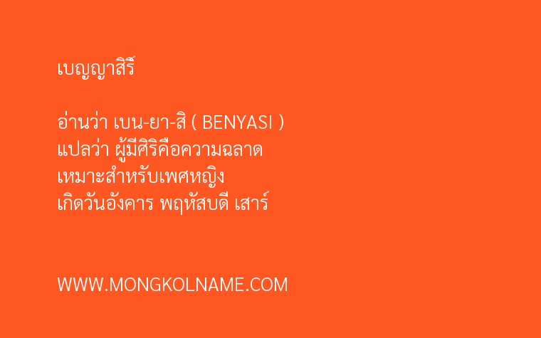 เบญญาสิริ์ มีความหมายในภาษาบาลี แปลว่า ผู้มีศิริคือความฉลาด ( BENYASI ) อ่านว่า เบน-ยา-สิ ตั้งชื่อมงคล เหมาะสำหรับเพศหญิง เกิดวันอังคาร พฤหัสบดี เสาร์