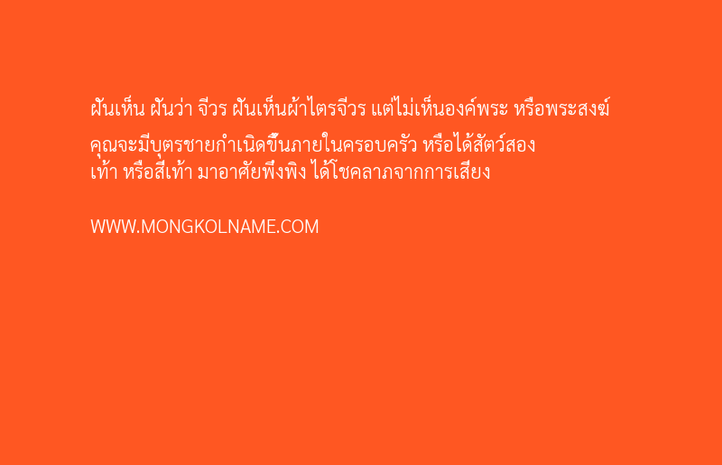 ฝันเห็น ฝันว่า จีวร ฝันเห็นผ้าไตรจีวร แต่ไม่เห็นองค์พระ หรือพระสงฆ์ คุณจะมีบุตรชายกำเนิดขึ้นภายในครอบครัว หรือได้สัตว์สอง เท้า หรือสี่เท้า มาอาศัยพึ่งพิง ได้โชคลาภจากการเสี่ยงฝันเห็น 'จีวร'