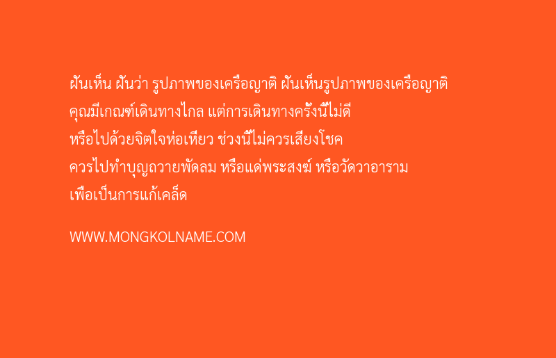 ฝันเห็นรูปภาพของเครือญาติ คุณมีเกณฑ์เดินทางไกล แต่การเดินทางครั้งนี้ไม่ดี หรือไปด้วยจิตใจห่อเหี่ยว ช่วงนี้ไม่ควรเสี่ยงโชค ควรไปทำบุญถวายพัดลม หรือแด่พระสงฆ์ หรือวัดวาอาราม เพื่อเป็นการแก้เคล็ด