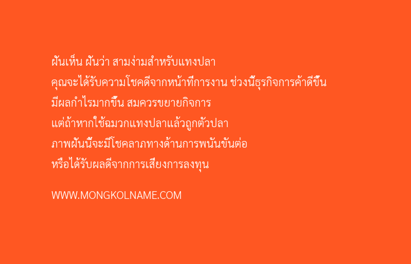 ฝันเห็น ฝันว่า สามง่ามสำหรับแทงปลา คุณจะได้รับความโชคดีจากหน้าที่การงาน ช่วงนี้ธุรกิจการค้าดีขึ้น มีผลกำไรมากขึ้น สมควรขยายกิจการ แต่ถ้าหากใช้ฉมวกแทงปลาแล้วถูกตัวปลา ภาพฝันนี้จะมีโชคลาภทางด้านการพนันขันต่อ หรือได้รับผลดีจากการเสี่ยงการลงทุนฝันเห็น 'สามง่ามสำหรับแทงปลา'