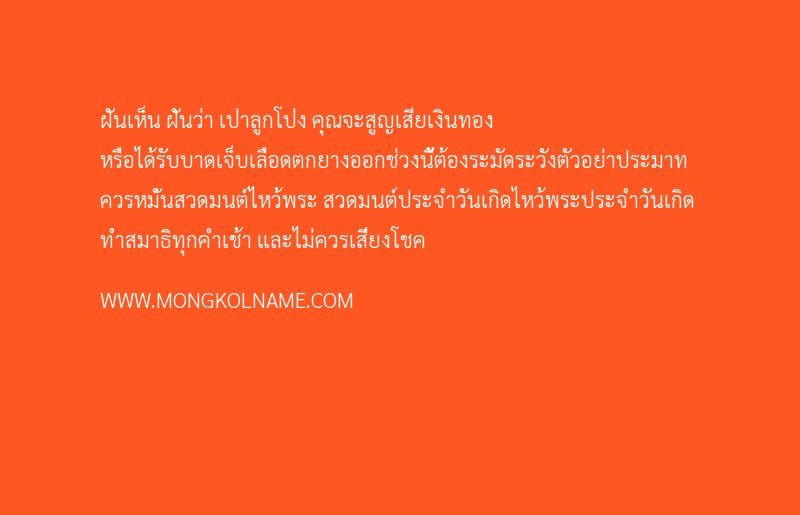 ฝันเห็น ฝันว่า เป่าลูกโป่ง คุณจะสูญเสียเงินทอง หรือได้รับบาดเจ็บเลือดตกยางออกช่วงนี้ต้องระมัดระวังตัวอย่าประมาท ควรหมั่นสวดมนต์ไหว้พระ สวดมนต์ประจำวันเกิดไหว้พระประจำวันเกิด ทำสมาธิทุกคำเช้า และไม่ควรเสี่ยงโชคฝันเห็น 'เป่าลูกโป่ง'