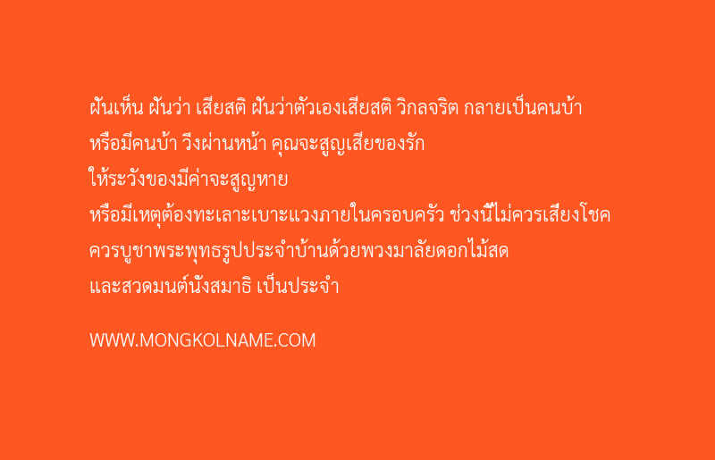 ฝันเห็น ฝันว่า เสียสติ ฝันว่าตัวเองเสียสติ วิกลจริต กลายเป็นคนบ้า หรือมีคนบ้า วิ่งผ่านหน้า คุณจะสูญเสียของรัก ให้ระวังของมีค่าจะสูญหาย หรือมีเหตุต้องทะเลาะเบาะแวงภายในครอบครัว ช่วงนี้ไม่ควรเสี่ยงโชค ควรบูชาพระพุทธรูปประจำบ้านด้วยพวงมาลัยดอกไม้สด และสวดมนต์นั่งสมาธิ เป็นประจำฝันเห็น 'เสียสติ'