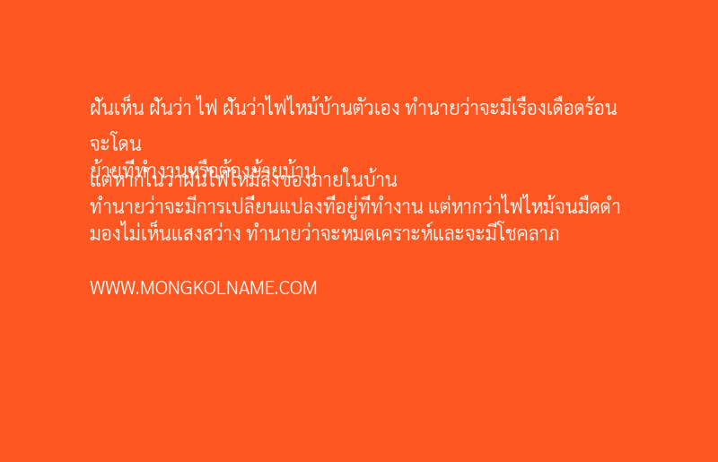 ฝันเห็น ฝันว่า ไฟ ฝันว่าไฟไหม้บ้านตัวเอง ทำนายว่าจะมีเรื่องเดือดร้อน จะโดน ย้ายที่ทำงานหรือต้องย้ายบ้าน แต่หากในว่าฝันไฟไหม้สิ่งของภายในบ้าน ทำนายว่าจะมีการเปลี่ยนแปลงที่อยู่ที่ทำงาน แต่หากว่าไฟไหม้จนมืดดำ มองไม่เห็นแสงสว่าง ทำนายว่าจะหมดเคราะห์และจะมีโชคลาภฝันเห็น 'ไฟ'