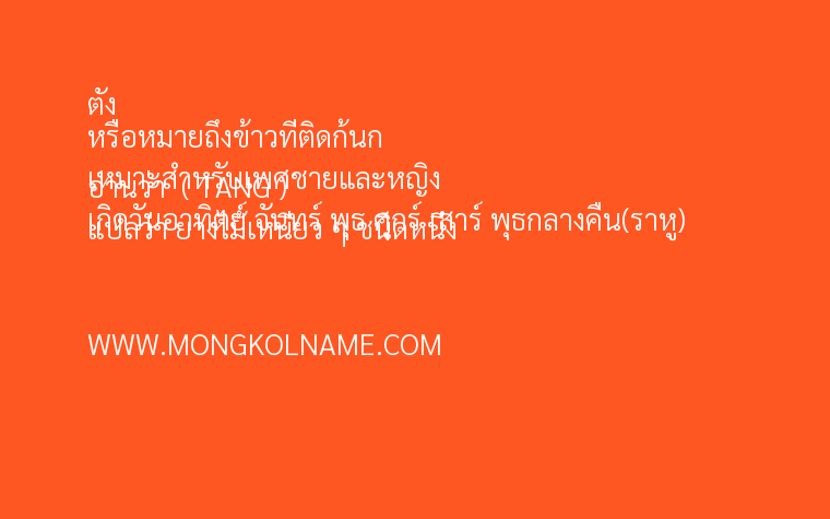 ตัง แปลว่า ยางไม้เหนียว ๆ ชนิดหนึ่ง หรือหมายถึงข้าวที่ติดก้นกระทะแล้วแซะเอาออกมาเป็นแผ่น เรียกว่า ข้าวตัง เอามาทอดกรอบแล้วจิ้มน้ำจิ้มก็ได้ เรียกว่า ข้าวตังหน้าตั้ง เหมาะสำหรับเพศชายและหญิง เกิดวันอาทิตย์ จันทร์ พุธ ศุกร์ เสาร์ พุธกลางคืน(ราหู)