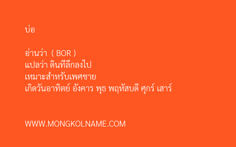บ่อ แปลว่า ดินที่ลึกลงไป เหมาะสำหรับเพศชาย เกิดวันอาทิตย์ อังคาร พุธ พฤหัสบดี ศุกร์ เสาร์