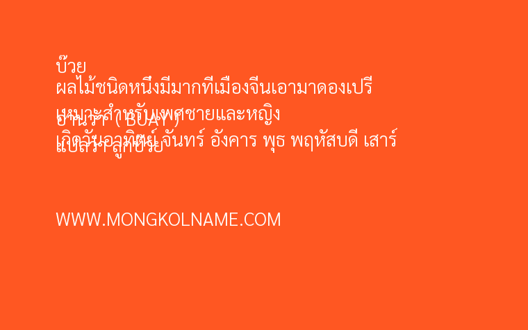 บ๊วย แปลว่า ลูกบ๊วย ผลไม้ชนิดหนึ่งมีมากที่เมืองจีนเอามาดองเปรี้ยว ดองเค็ม หรือชงน้ำร้อนใส่น้ำแข็งเป็นเครื่องดื่มก็ได้ เหมาะสำหรับเพศชายและหญิง เกิดวันอาทิตย์ จันทร์ อังคาร พุธ พฤหัสบดี เสาร์